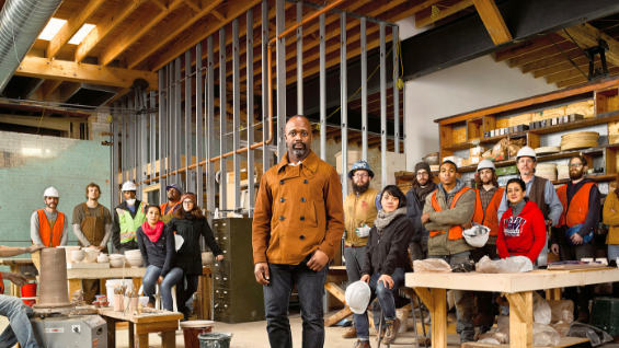 Theaster Gates was born in Chicago in 1973. He first encountered creativity in the music of Black churches on his journey to becoming an urban planner, potter, and artist. Gates' practice includes sculpture, installation, performance and urban interventions that aim to bridge the gap between art and life. Gates works as an artist, curator, urbanist, and facilitator and his projects attempt to instigate the creation of cultural communities by acting as catalysts for social engagement that leads to political and spatial change. Gates’s non-profit, Rebuild Foundation, manages the many projects in his Chicago hometown—including the Stony Island Arts Bank, Black Cinema House, Dorchester Art and Housing Collaborative, Archive House, and Listening House—while extending its support to cities throughout the American Midwest. Many of the artist’s works evoke his African-American identity and the broader struggle for civil rights, from sculptures incorporating fire hoses, to events organized around soul food, and choral performances by the experimental musical ensemble Black Monks of Mississippi, led by Gates himself.