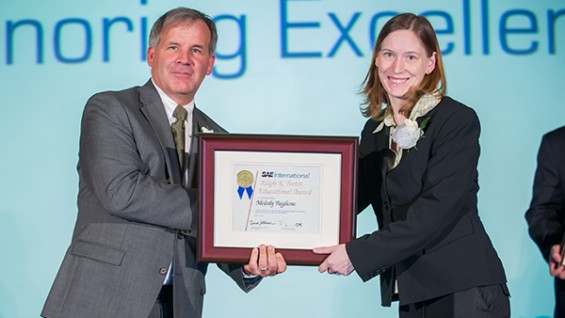 Professor Baglione accepted the Teetor award at the annual Society of Automotive Engineers Congress in Detroit in April 2013, and spent several days networking with others in the field. "I am honored to receive the SAE Teetor Award," says Baglione, adding that as a recipient she was "afforded an invaluable opportunity to network with industry professionals and academics from around the world." Prof Baglione has previously received an Outstanding Presenter Award from SAE and continues to publish in journals and regularly presents at conferences for SAE and ASME.