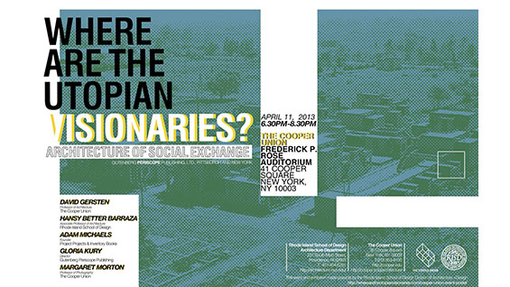 Please join us for the reception and panel discussion "Where are the Utopian Visionaries? Architecture of Social Exchange" on Thursday, April 11th, 6:30– 8:30pm at The Cooper Union - Frederick P. Rose Auditorium. This panel discussion, drawing content from a recent publication entitled Where are the Utopian Visionaries? Architecture of Social Exchange, edited by Hansy Better Barraza, aims to showcase the work of contemporary architects, designers, and thinkers who continue to address one of the most poignant questions of our time: what is the role of social and community building in the practice of architecture?