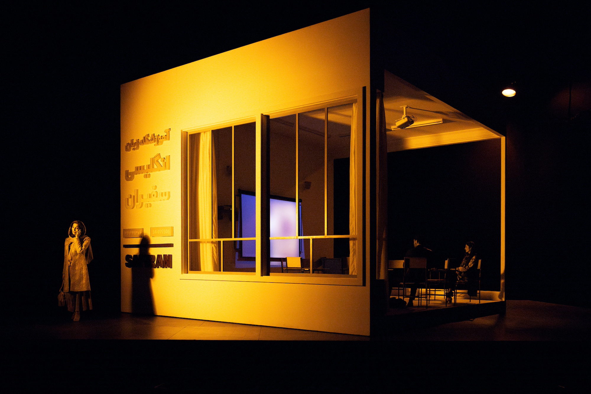 English takes place in an Iranian classroom where four Farsi-speaking adult learners practice for their English proficiency exams. To dramatize questions of identity and the linguistic complexity at the center of the play, Ginsberg designed a rotating box-like set, lauded by the New York Times for “offer[ing] changing perspectives on action.” The play won the Pulitzer Prize in Drama in 2023 before making its Broadway debut this year.
