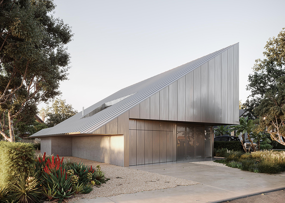 On a quiet street in Altadena, a compact home rises from a fire-affected landscape, designed for resilience, affordability, and ecological harmony. A gravel perimeter forms a low-maintenance, ignition-resistant buffer, while native, drought-tolerant plants bring beauty and regeneration to the site. Clad in fire-resistant standing seam metal with perforated rainscreens for shade and ventilation, the house combines durability with lightness. New but contextual, it adopts a pitched roof and modest scale, integrating into the neighborhood with quiet confidence.
