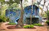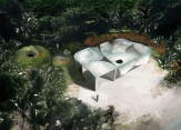 Located further inland from the Lodge nestled into the jungle’s canopy is the Glitch House at the Retreat. The building consists of 1,800 interior square feet and 330 square feet of accessible roof garden. The House contains 3 bedrooms, 2 bathrooms, as well as communal living areas. The exterior features cement tiles hand made in the Dominican Republic. The graphic pattern applied to its surface interferes with the legibility of the concrete block geometry of the house relative to the background of the tropical landscape. The Glitch House is the first structure a guest sees upon arriving at the Wellness Retreat. Rather than marking this moment with a defined boundary or gate house, the Glitch House strangely smears itself into the jungle landscape. It is a hint towards the immersive experiences that guides the design for the Retreat in general.