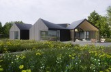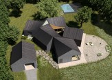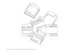 Located on a 2 acre lot adjacent to a historic house in Bridgehampton, New York, the “Six Square House” is made up of six 24’x24’ modules each featuring a gabled geometry. The six modules are composed to create continuous momentum between exterior roof ridges, while roof eaves flow upward and downward along curves to break away from tradition. While simple exterior materials highlight the dynamic roof geometry from various viewpoints around the site, the roof composition translates to the house’s interior and naturally delineates 6 distinct programs. The 3,500 square foot house contains 2 bedrooms, 3 bathrooms, kitchen, living spaces, an outdoor porch and garage. Living spaces open directly onto a landscape designed for entertaining: central court, meadow and pool house. The kitchen, located at the center of the house, is adjacent to a “left-over” triangular court and looks through the open porch that frames views of landscape beyond. Living spaces and kitchen are linked to one another to serve as a large open space emphasizing the flow of continuous ruled ceiling geometry, while bedrooms feature framed views of the site’s mature and gnarled trees for privacy. Standing in the middle of the site, one can glimpse archetypal gables silhouetted against the undulating roof geometries, emphasizing the evolution of the typology in a layering of forms.