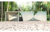 The Beach Spa sits adjacent to the Lodge, nestled partially below grade as a unified collection of 6 rock-like masses. The Spa program includes an open-air massage space, steam and outdoor showers, underground sauna, cold plunge pool and an air conditioned treatment room. The interstitial space between masses provides circulation to the various programs. The geometry of the Spa is broadly suggestive of formations like naturally eroded rock or strange ruins. A closer reading reveals a carefully controlled unification of the 6 discrete volumes via inverting readings of symmetry, continuity, alignment, tangency and a singular architectural cropping envelope that bounds the entirety of the program. The sparkling concrete of the forms is embedded with green quartz aggregate that is willfully revealed in areas by sandblasting. Deep scraping in the concrete adds an additional layer of texture and relates to areas of runoff from pooling water on the roofs. Together, the additional concrete color and texture serve to reinforce the shifting reading of the volumes instigated by the geometry itself.