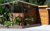 The retaining walls in the hillside garden and patio area were totally re built and reconfigured creating a lower patio framed by la landscape of local plants that and a ground treatment of railroad ties and ground cover provide complete privacy for an outdoor shower.