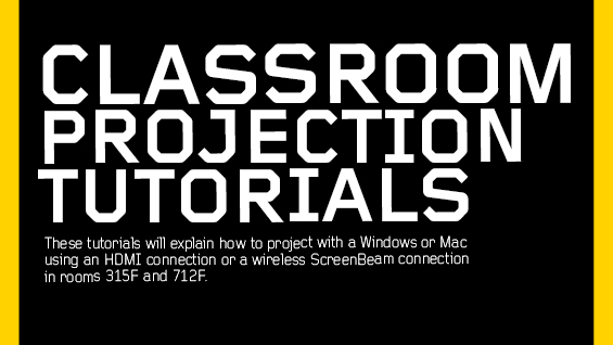 The tutorials in this PDF booklet and the videos below explain how to project with a Windows or a Mac using an HDMI connection or a ScreenBeam wireless connection in rooms 315F and 712F. Use the PDF bookmarks and links below to navigate the instructional material: