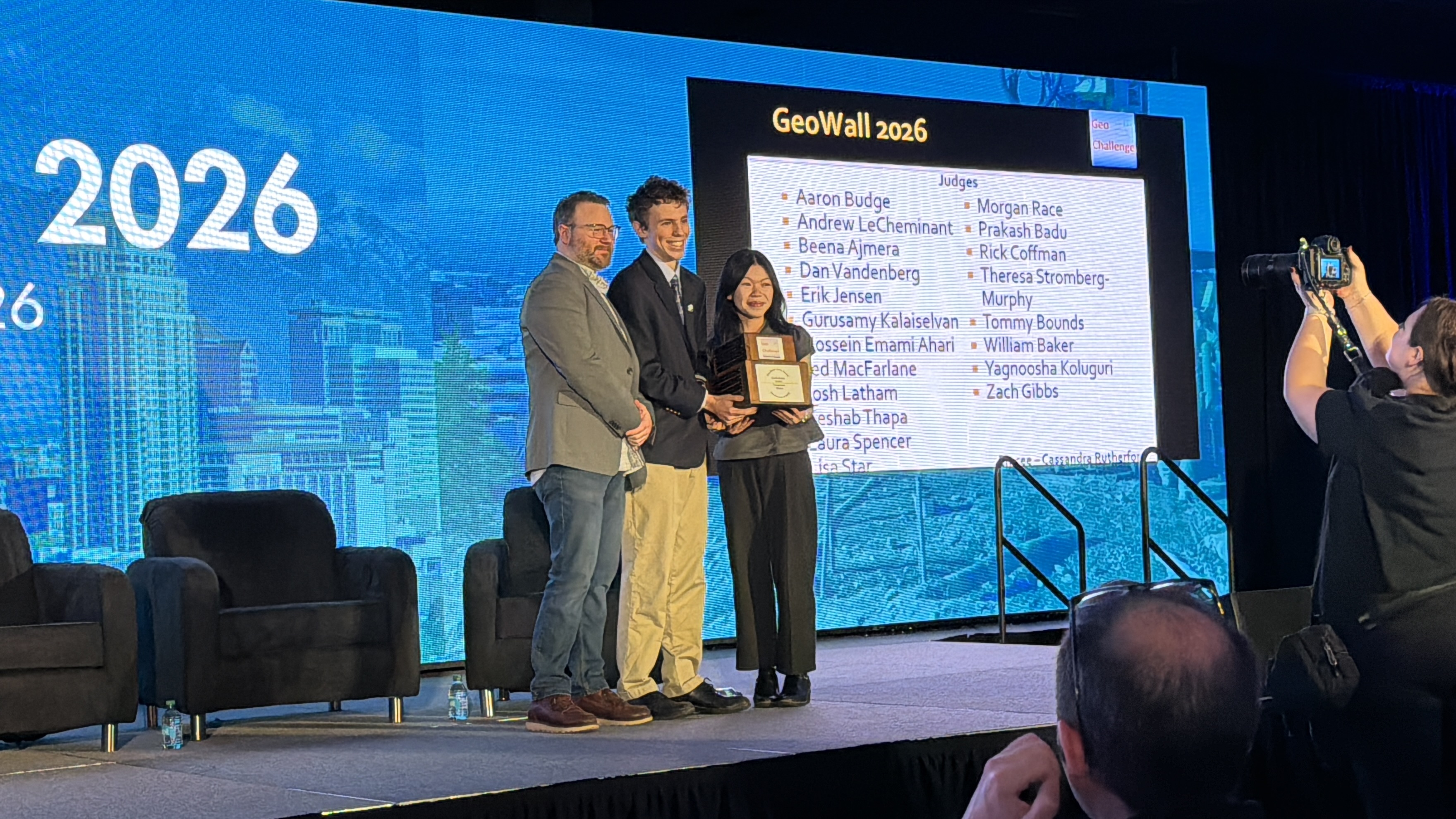 Civil engineering seniors Sinclair Kennedy-Nolle and Isabella Ng accept the Mohr's Circle Trophy at the 2026 Geo-Congress in Salt Lake City, Utah.