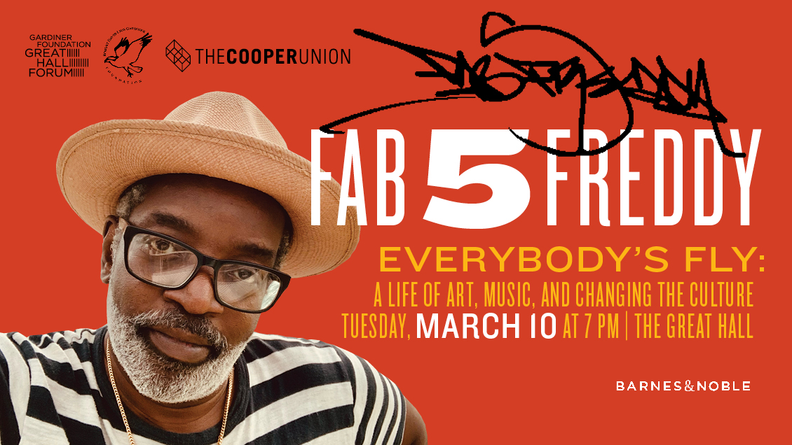 Join Fab 5 Freddy for a special Cooper Union Gardiner Foundation Great Hall Forum event celebrating the release of his first memoir, Everybody’s Fly: A Life of Art, Music, and Changing the Culture. It is an essential, street-level cultural history into how New York’s underground art and music scene—guided by Fab 5 Freddy’s singular vision of what could be possible—irrevocably transformed mainstream culture from the late 1970s to today. Barnes & Noble Union Square will be on site with books available for purchase.