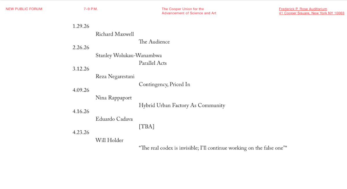 New Public Forum is a series of student-led lectures and demonstrations held at The Cooper Union for the Advancement of Science and Art, aimed at instituting public dialogue between various fields as they evolve and adapt to a changing world. With actions and words, we attempt to rattle or dismount the stability of entrenched systems and constructs, speculating on evolving approaches to creative and technical disciplines. The series will highlight critical practices that synthesize historical and current developments with an emphasis on speculation over retrospective preoccupation. The program constitutes a public forum for exchange, towards new critical approaches across fields and geographies.
