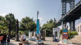 Claudia Wieser, Rehearsal, 2021. Ceramic, digital prints, stainless steel. Presented by Public Art Fund at Brooklyn Bridge Park, July 29, 2021 - April 17, 2022. Courtesy Claudia Wieser; Marianne Boesky Gallery New York and Aspen; and Jessica Silverman, San Francisco. Photo: Nicholas Knight, Courtesy of Public Art Fund, NY.