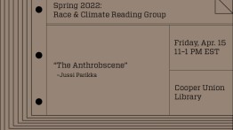 Launched in the Spring of 2020, the Race and Climate Reading group was created in response to Cooper Union student requests to invest in discussions that center issues of race and social justice and how they intersect with the climate crisis that we are all deeply mired in at the moment. As we all know, the climate crisis effects communities of color first, and disproportionately. And, as the readings all attest, this is reflective of and a culmination of centuries of oppression, and settler colonialism. The concept of the group: