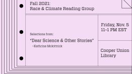 Launched in the Spring of 2020, the Race and Climate Reading group was created in response to Cooper Union student requests to invest in discussions that center issues of race and social justice and how they intersect with the climate crisis that we are all deeply mired in at the moment. As we all know, the climate crisis effects communities of color first, and disproportionately. And, as the readings all attest, this is reflective of and a culmination of centuries of oppression, and settler colonialism. The concept of the group: