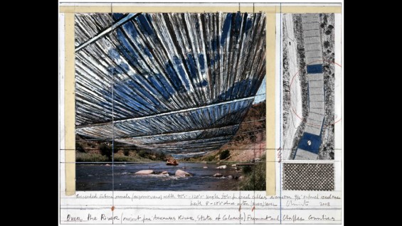 IMAGE CREDIT: Christo, Over The River, Project for Arkansas River, State of Colorado, Collage 2007, 35,5 x 28 cm (14″ x 11″), Pencil, enamel paint, photograph by Wolfgang Volz, wax crayon, aerial photograph with topographic elevations, fabric sample, and tape. Photo: Wolfgang Volz, © Christo.