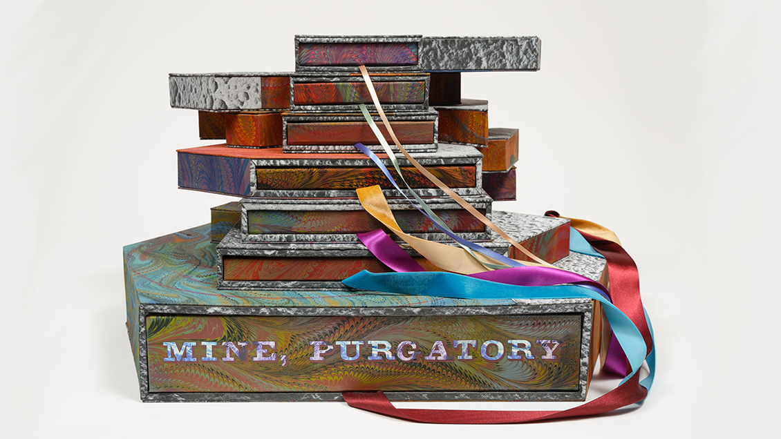 Dante Alighieri’s Divine Comedy serves as a framework for Nguyen’s examination of the history of the Cold War and relations between the United States and other countries, particularly those in the Non-Aligned Movement. Regional histories and events are used to illustrate the neocolonial exploitation of Asian and African countries by Western powers. Nguyen’s work combines sculptural elements with screen-prints, handset type, and hand-made and hand-marbled papers. The Inferno (2023) includes nine books, corresponding to Dante’s nine circles of Hell. Displayed in the Library are three titles from that group: A Welter of Language, Snake in the Grass, and Open Eyes. In Mine, Purgatory (2024), Nguyen combines seven accordion-fold books in a sculptural stack referencing “Mount Purgatory” from Dante’s text. Tammy Nguyen’s artist book exploring Dante’s Paradiso is inspired by the idea that Dante’s ascent into the celestial heavens is a journey of expanding knowledge, where learning is like eating the “bread of angels”. The Inferno and Purgatory books have previously been shown at exhibitions in Seoul and London, in 2023 and 2024. The recent books were made in conjunction with Nguyen’s large-scale paintings on display concurrently at the Lehmann Maupin gallery in Chelsea (June 5 to August 15).