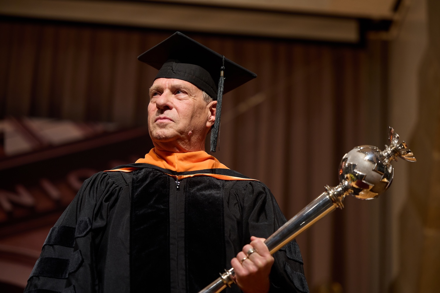 Retiring Professor of Mechanical Engineering George Sidebotham holds the ceremonial mace