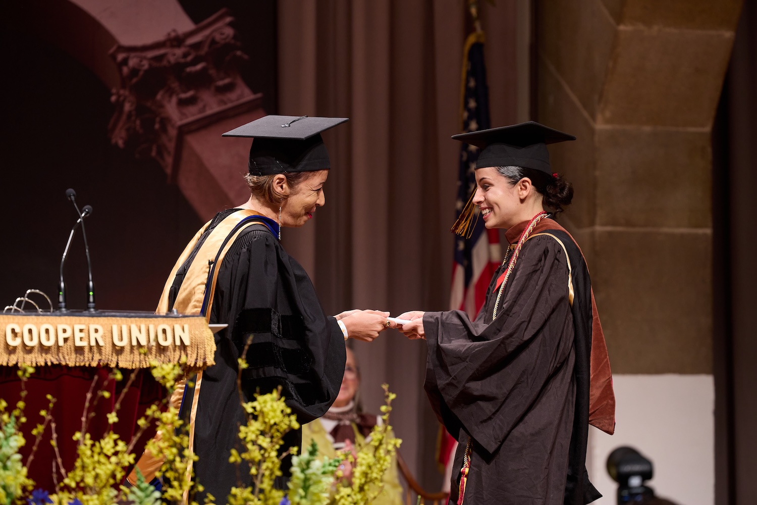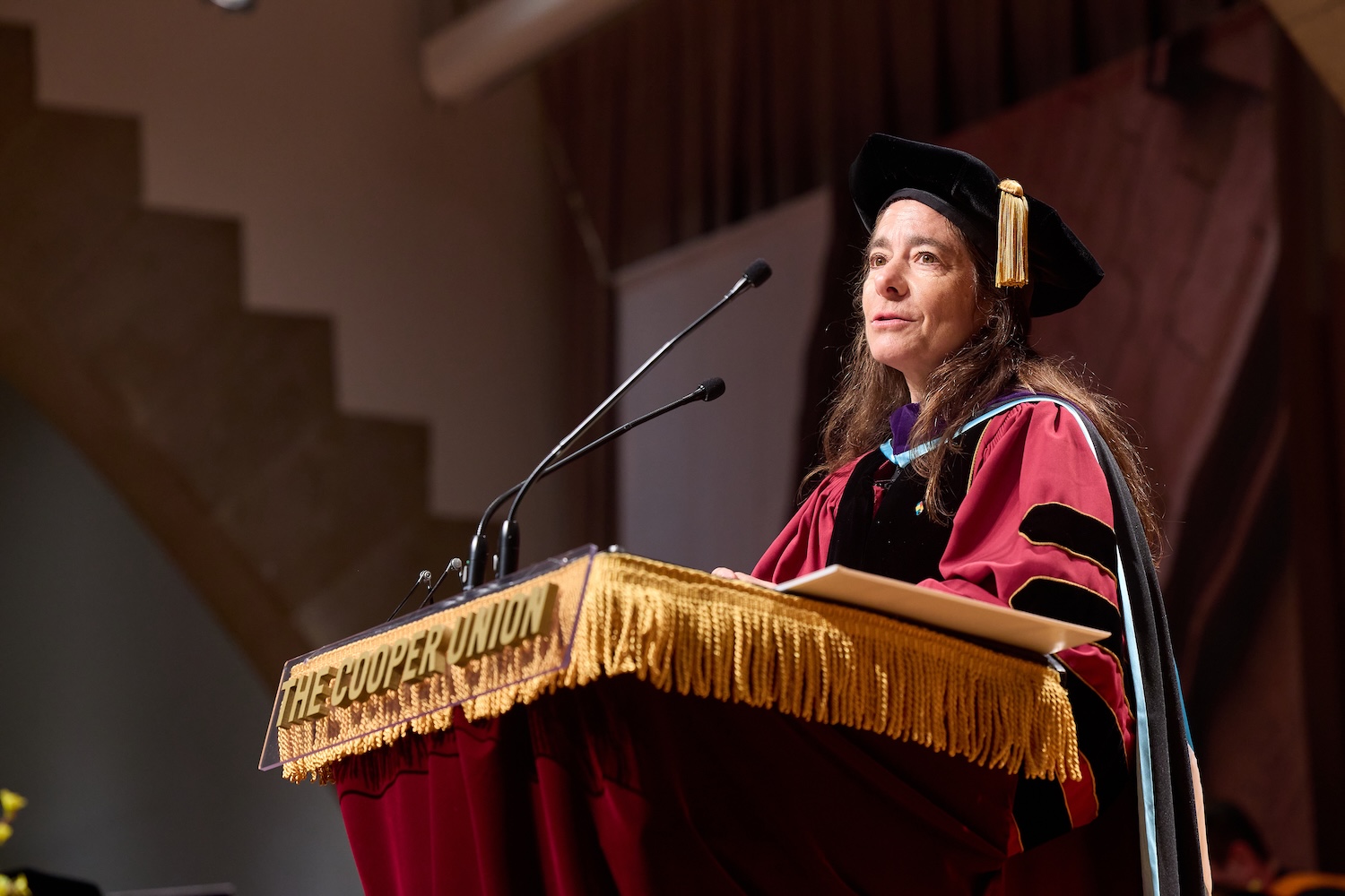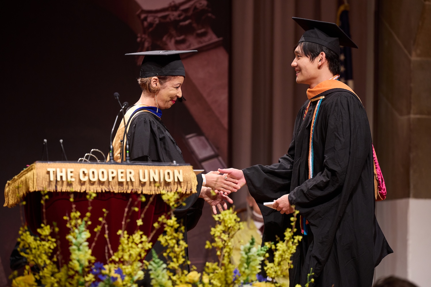 The 165th Commencement of The Cooper Union was held on Thursday, May 29, 2025, in the Great Hall. Interim President Malcolm King EE’97 presided over the ceremony, welcoming attendees and commending the Class of 2025 on their achievements. A rendition of the National Anthem was performed by Camille Rotemberg, a graduating senior in the Albert Nerken School of Engineering. Ross Wisnewski, a longtime supporter of Cooper along with her husband George Reeves ME’64, delivered the invocation. Watch the full ceremony here.