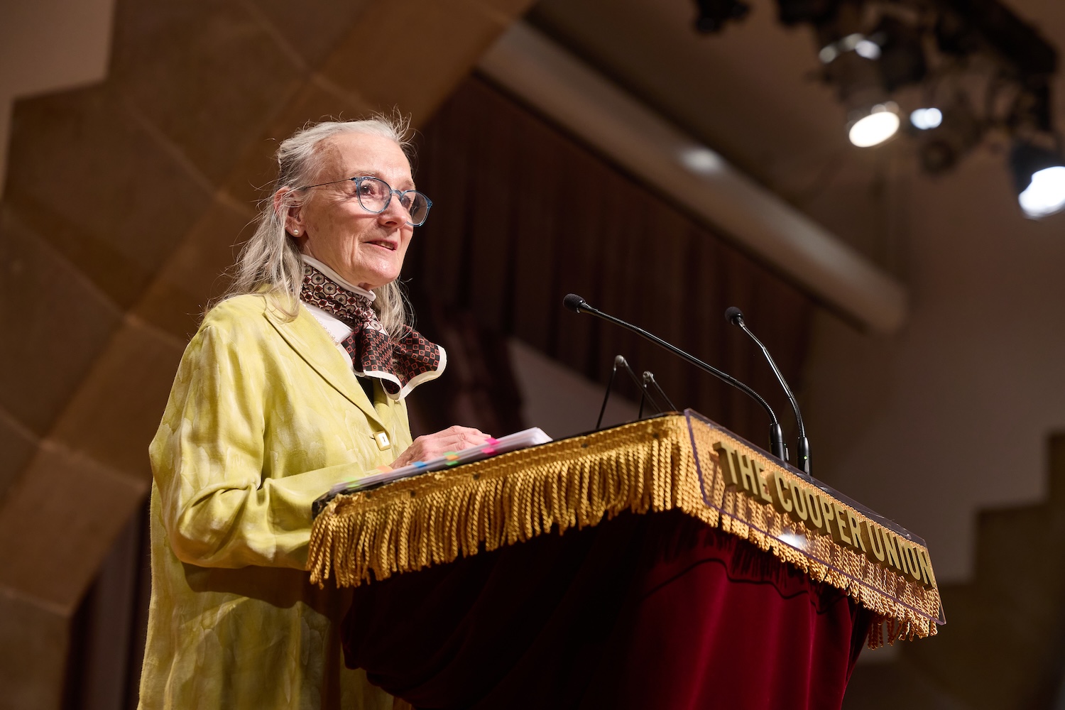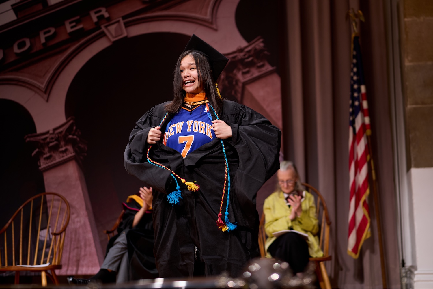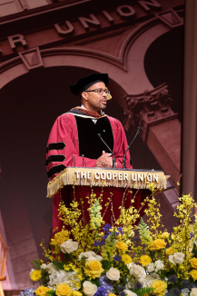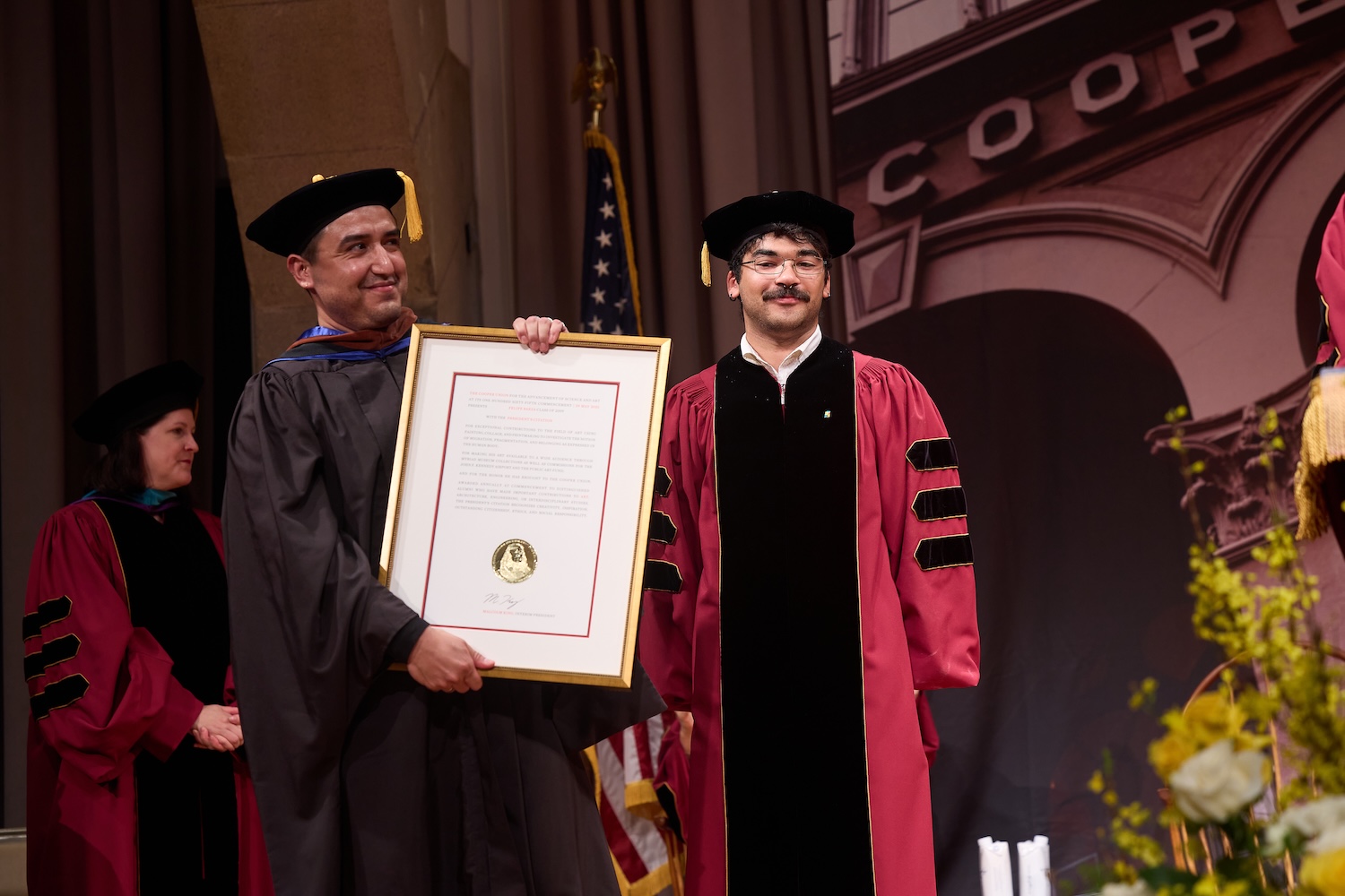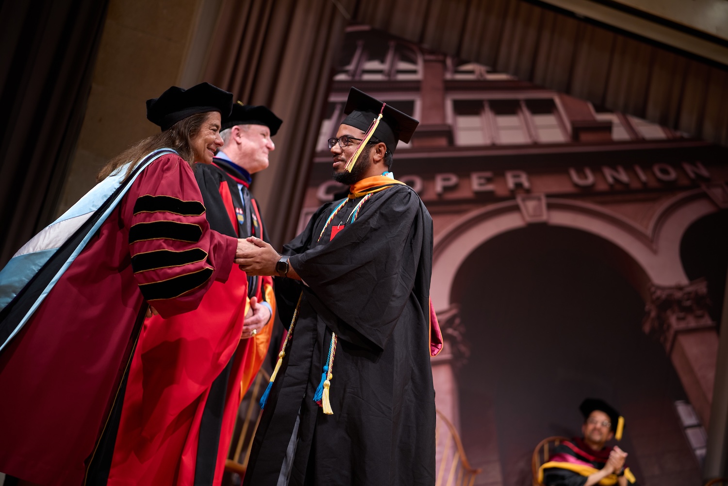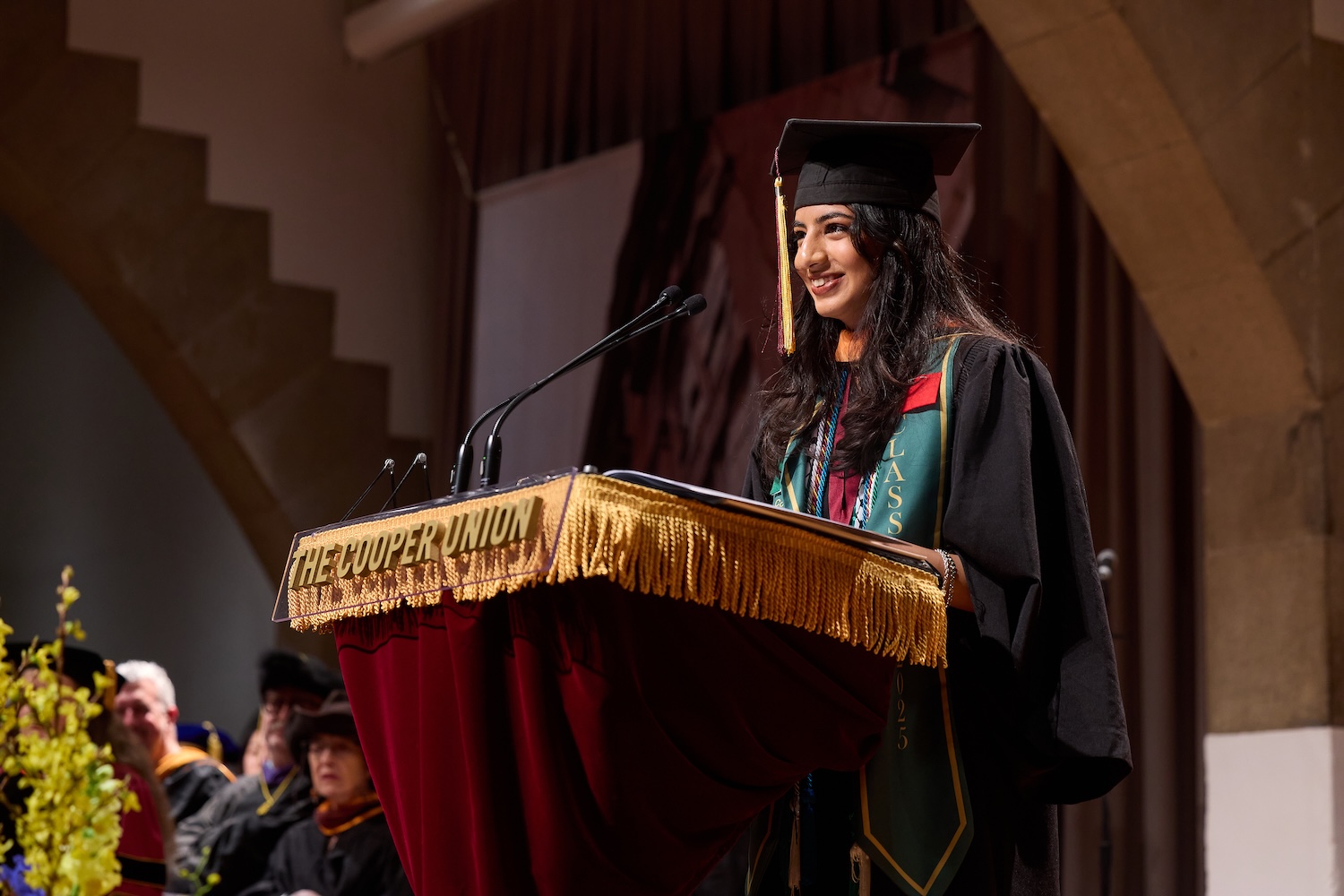 Zareena Al-Shehab, a chemical engineering major, was selected to deliver the class’s student commencement address. Remarking on the “unprecedented times” in which her generation found themselves, Al-Shehab said, “Unprecedented isn’t just a word that describes the world we inherited. It is a word that describes us. The Class of 2025 is unprecedented as hell.” She expressed gratitude to her parents and the Cooper community and offered encouraging words to her classmates in the face of pressing global challenges: “What we build, whether with our hands, our minds, or our hearts, has the power to strengthen communities and leave a lasting legacy. It is not just about what we create, but about the impact we leave behind. It is now our turn to be the giants whose shoulders’ future generations will stand on.”