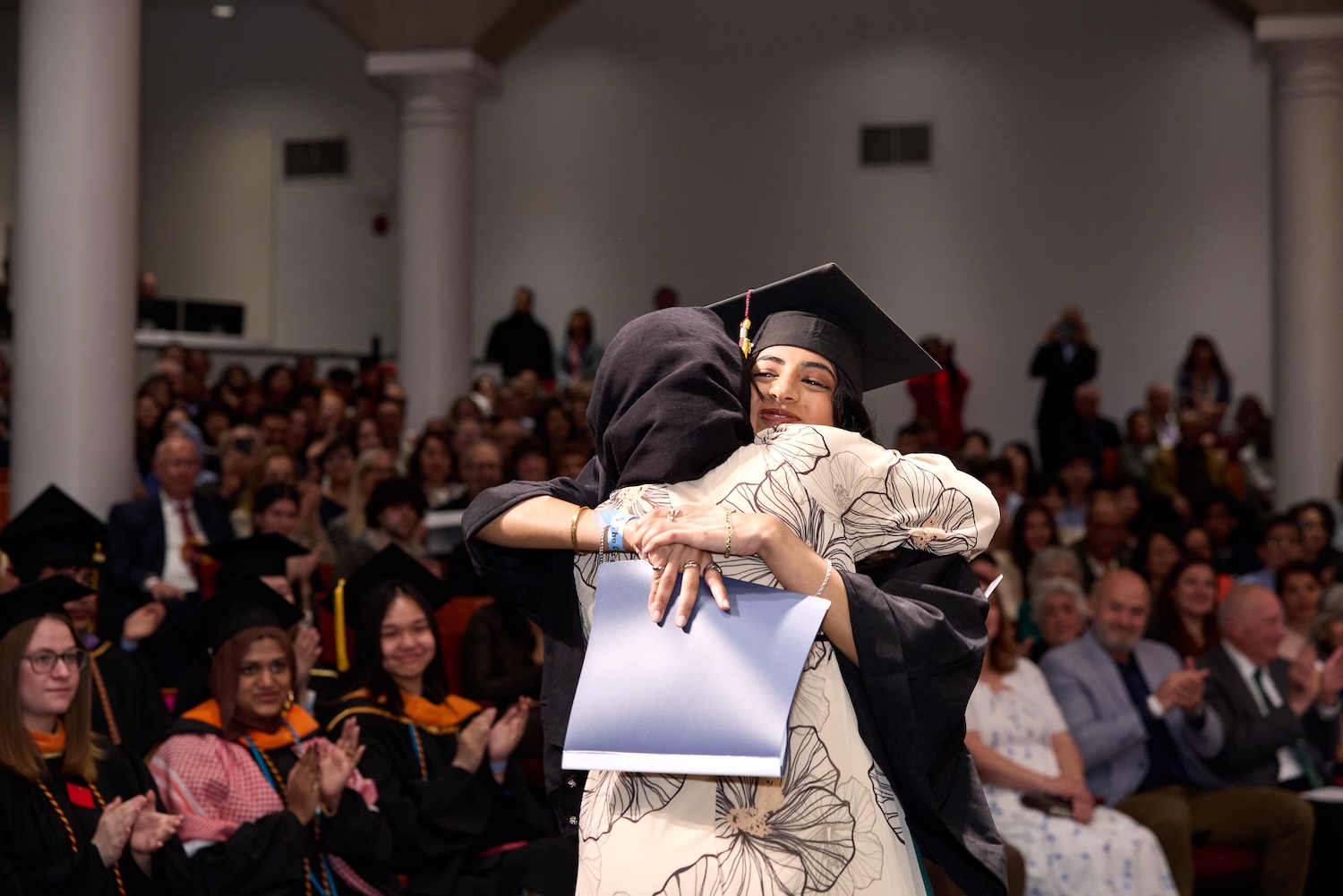 Student speaker Zareena Ayesha Al-Shehab hugs her mom following giving her speech