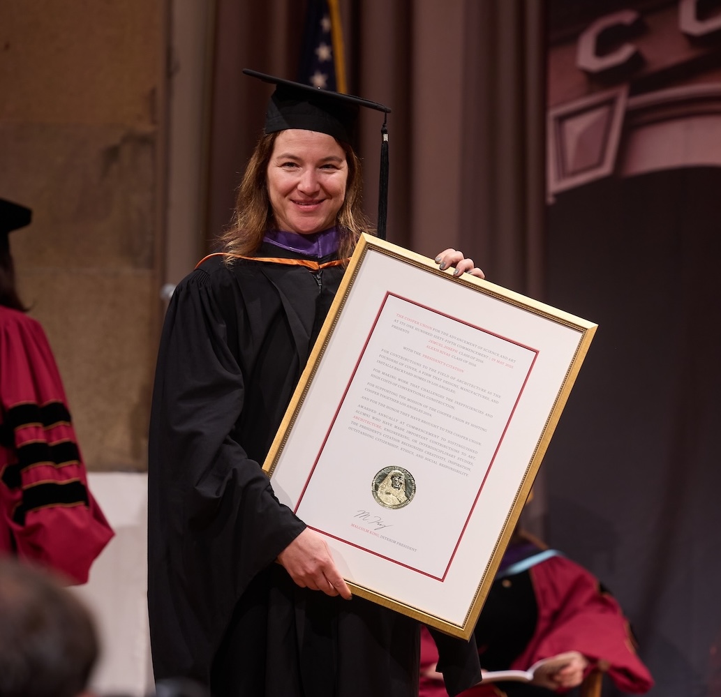 Acting Dean of Architecture Hayley Eber AR’01 accepts the Presidential Citation on behalf of Jemuel Joseph AR’16 and Alexis Rivas AR’16