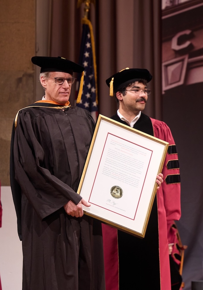 Felipe Baeza A’09 receives the President's Citation from Student Trustee Tre Brown ME’26