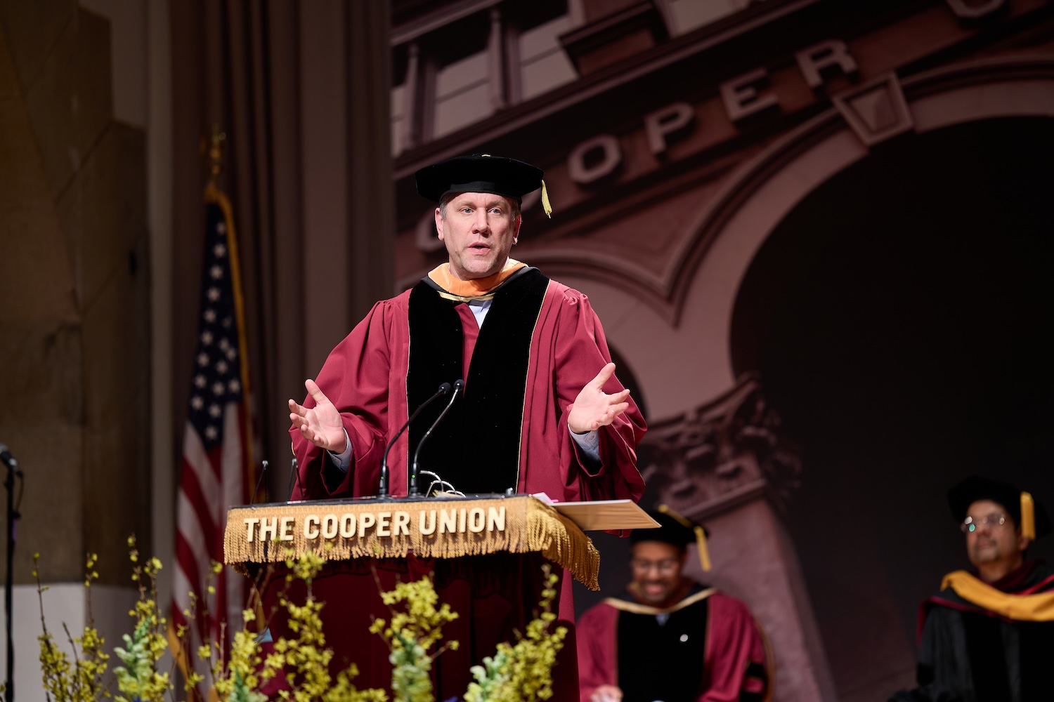 The Cooper Union Alumni Association President Ron Vogel welcomes the newest Cooper alumni to close the ceremony