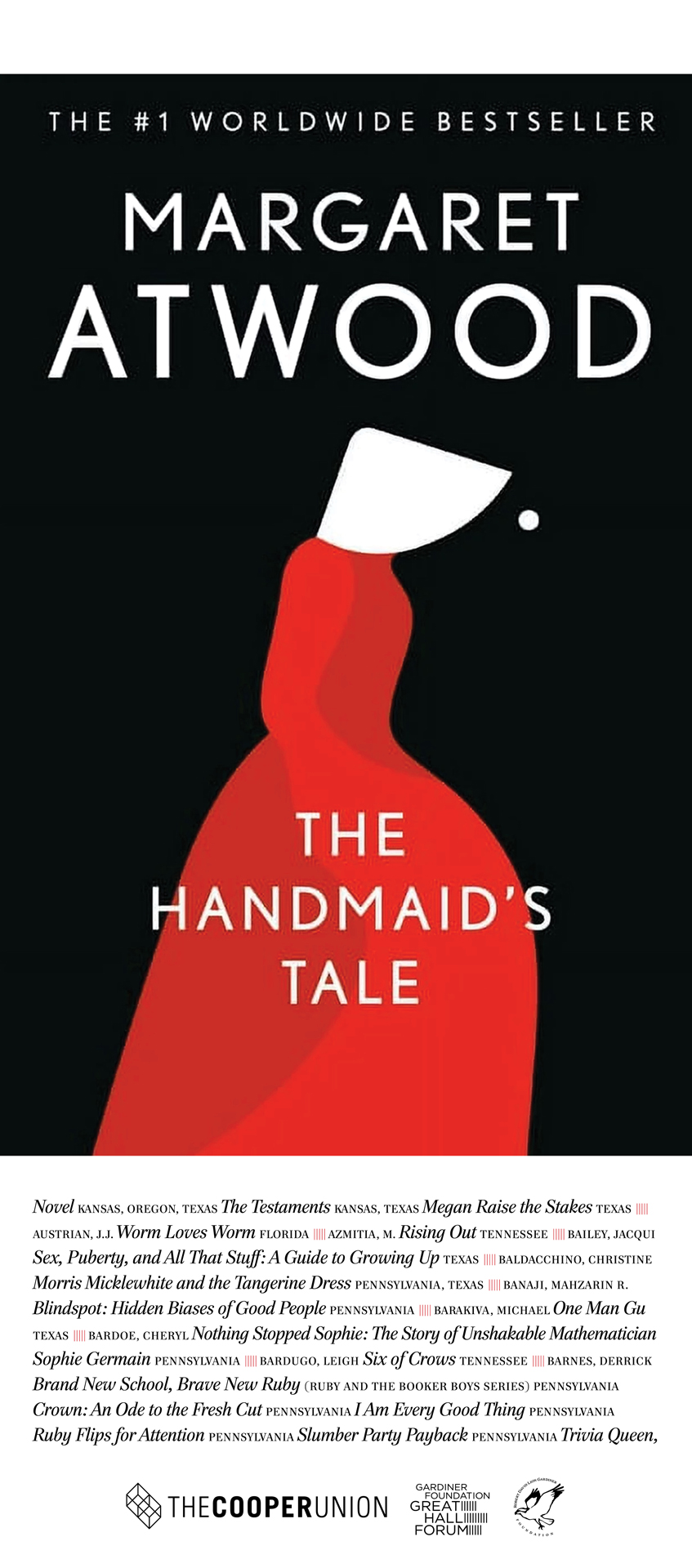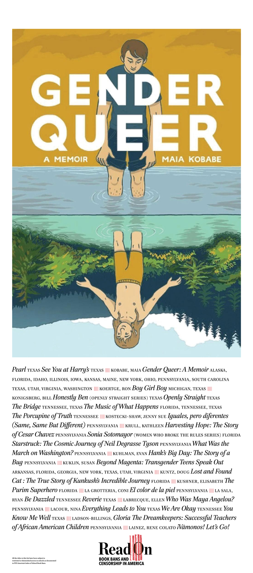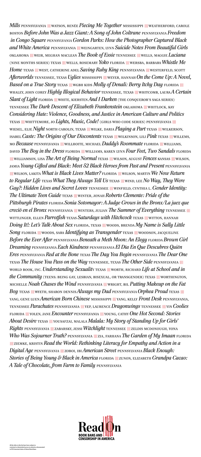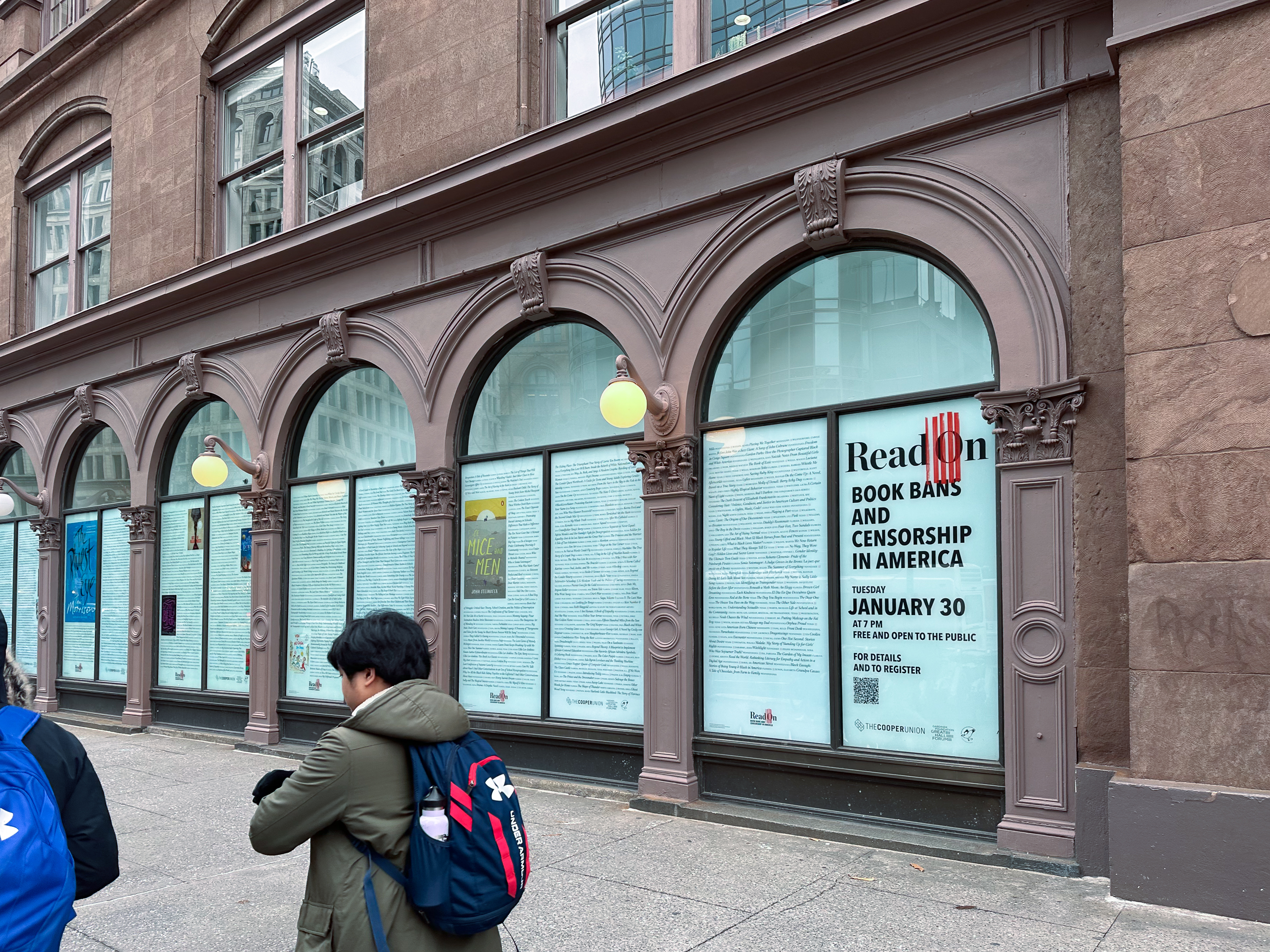 Across the country, book bans and challenges have reached record levels. In conjunction with the event Read On: Book Bans and Censorship in America, this exhibition in the colonnade windows of the Foundation Building features a list of book titles that have been subject to restricted or diminished access in schools, as documented in PEN America’s Index of School Book Bans.