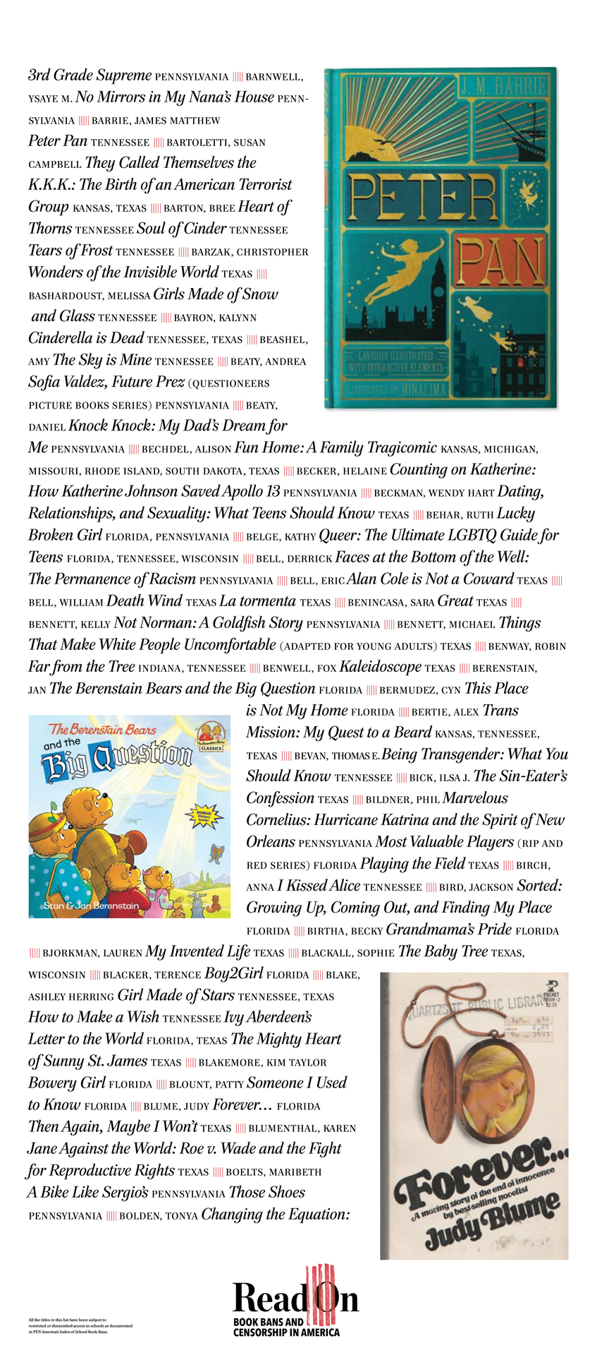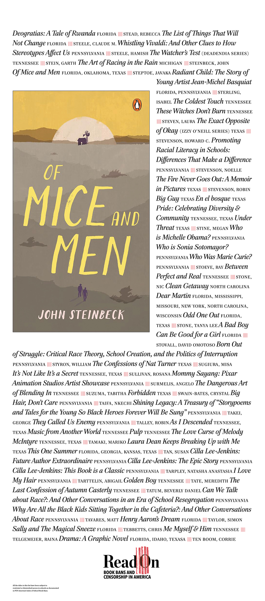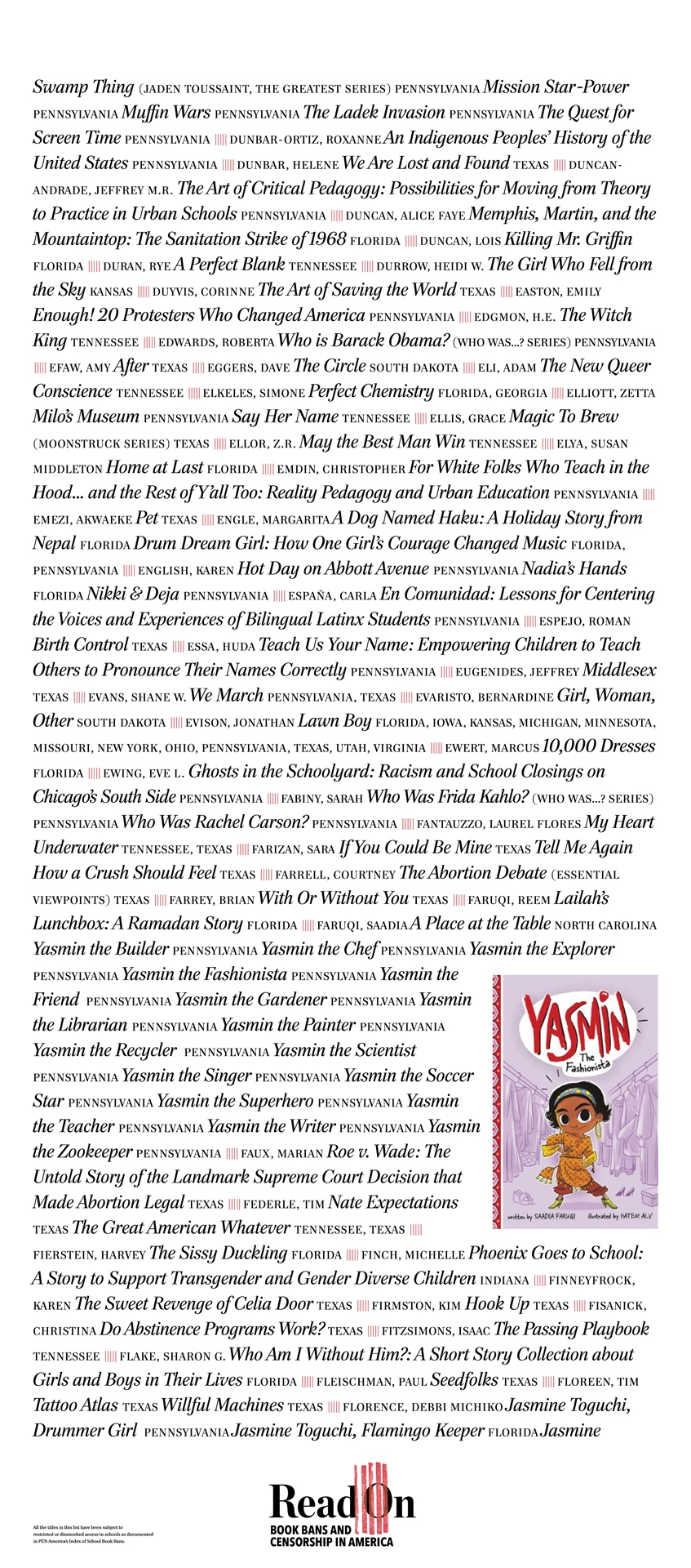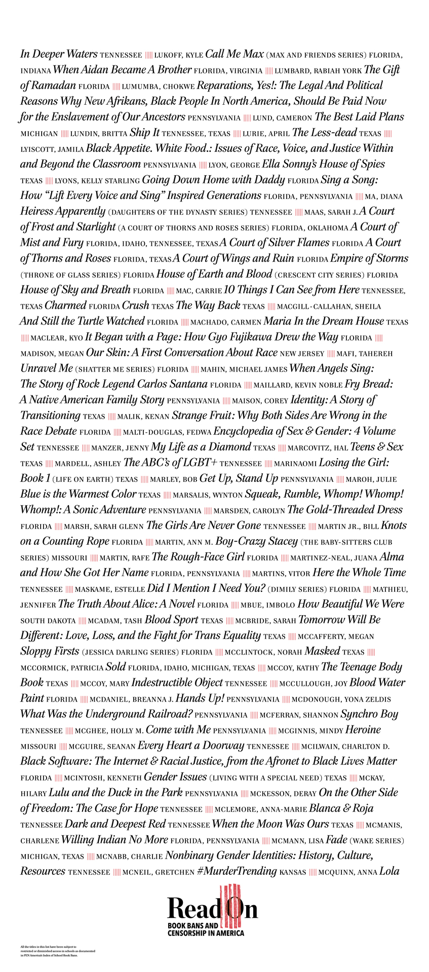Across the country, book bans and challenges have reached record levels. In conjunction with the event Read On: Book Bans and Censorship in America, this exhibition in the colonnade windows of the Foundation Building features a list of book titles that have been subject to restricted or diminished access in schools, as documented in PEN America’s Index of School Book Bans.