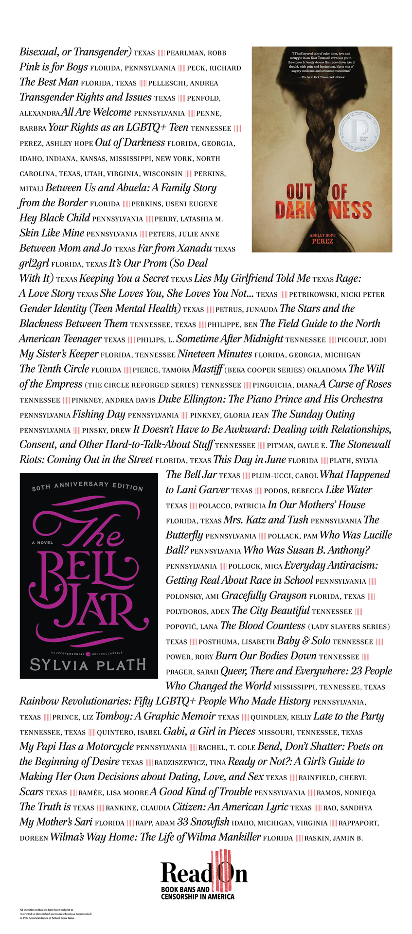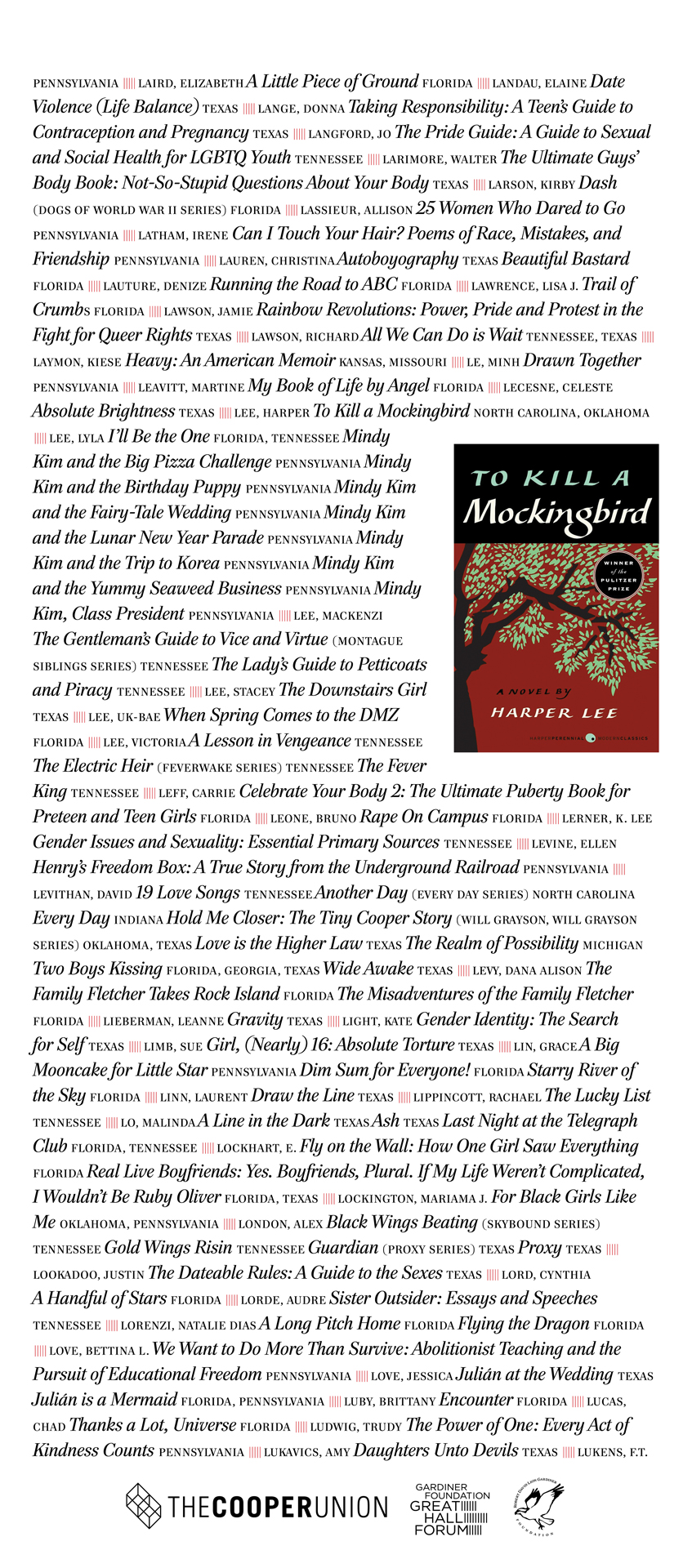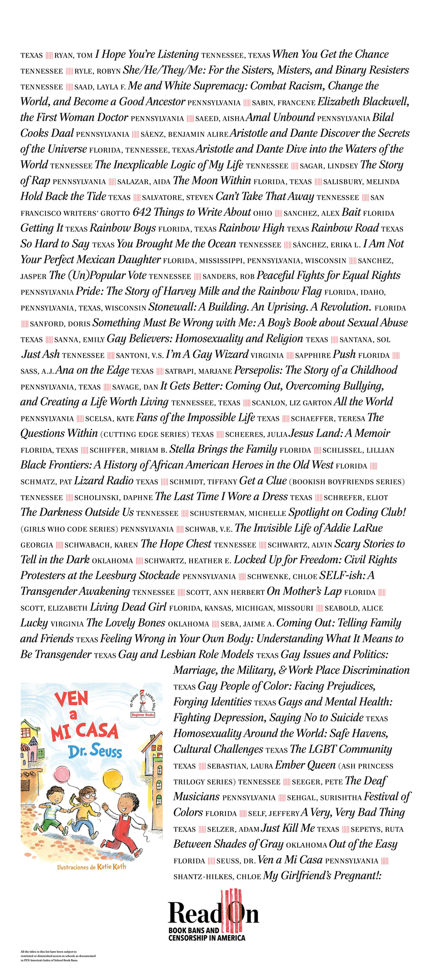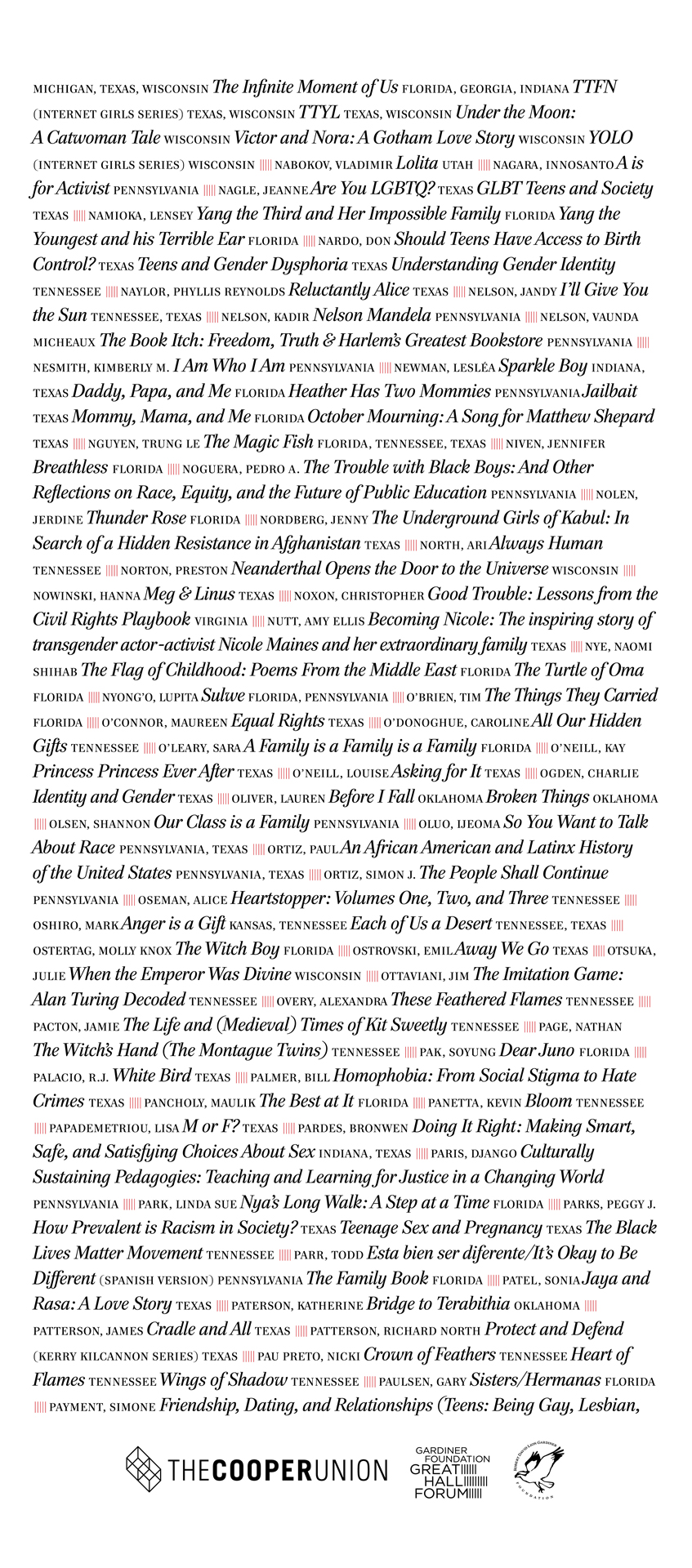 Across the country, book bans and challenges have reached record levels. In conjunction with the event Read On: Book Bans and Censorship in America, this exhibition in the colonnade windows of the Foundation Building features a list of book titles that have been subject to restricted or diminished access in schools, as documented in PEN America’s Index of School Book Bans.