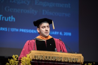 The inauguration of The Cooper Union's thirteenth president, Laura Sparks, took place on Tuesday, February 6 in the Great Hall. Guests traveled from schools across the country to offer their institutions' greetings, and three alumni spoke, before President Sparks addressed the audience. The gallery below shows some of the highlights of the event, a morning filled with reflections on the accomplishments of students and alumni and the community's hopes for the future of the school.
