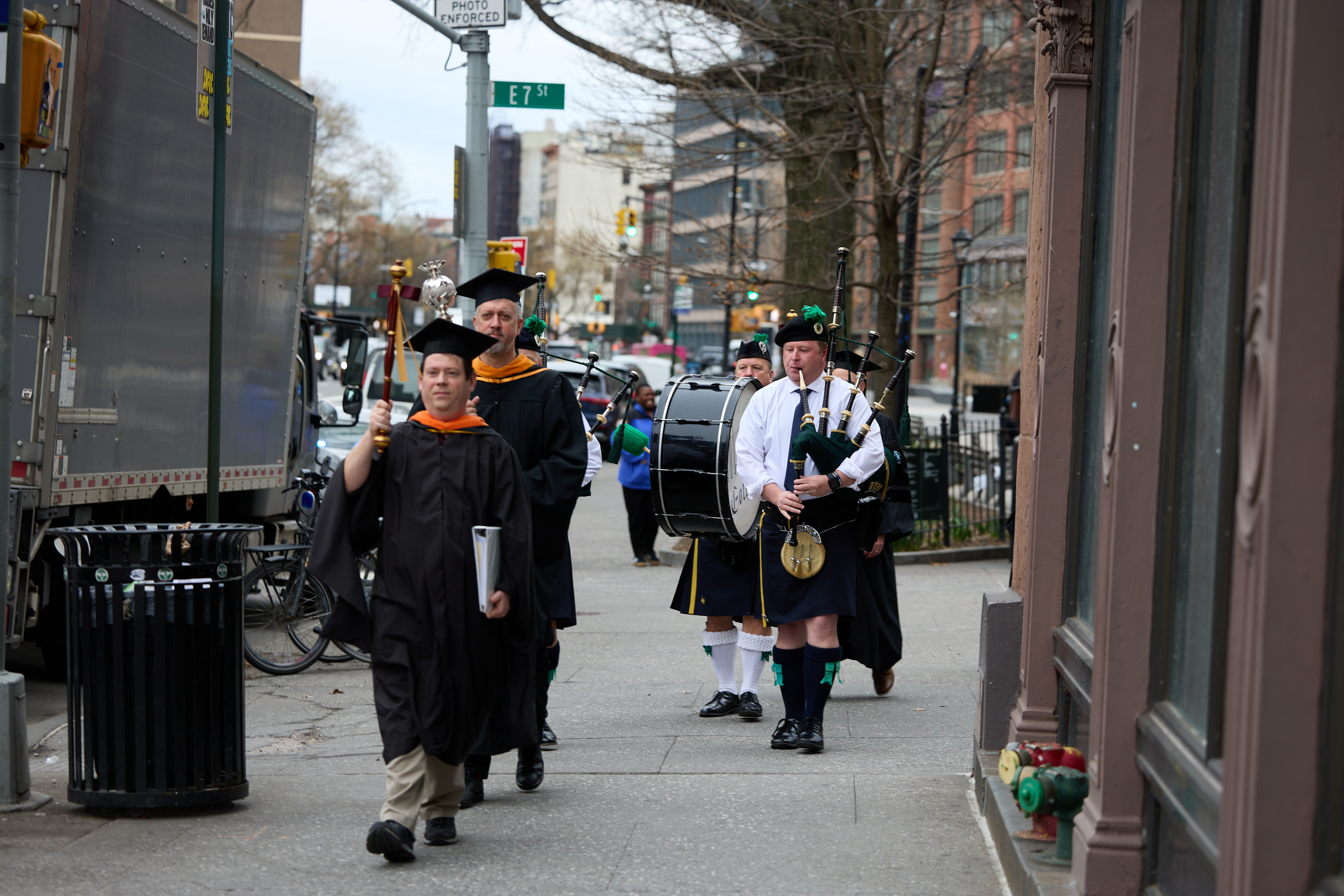 Brian Cusack ME'01 MEng'03, adjunct professor of mechanical engineering, leads the procession