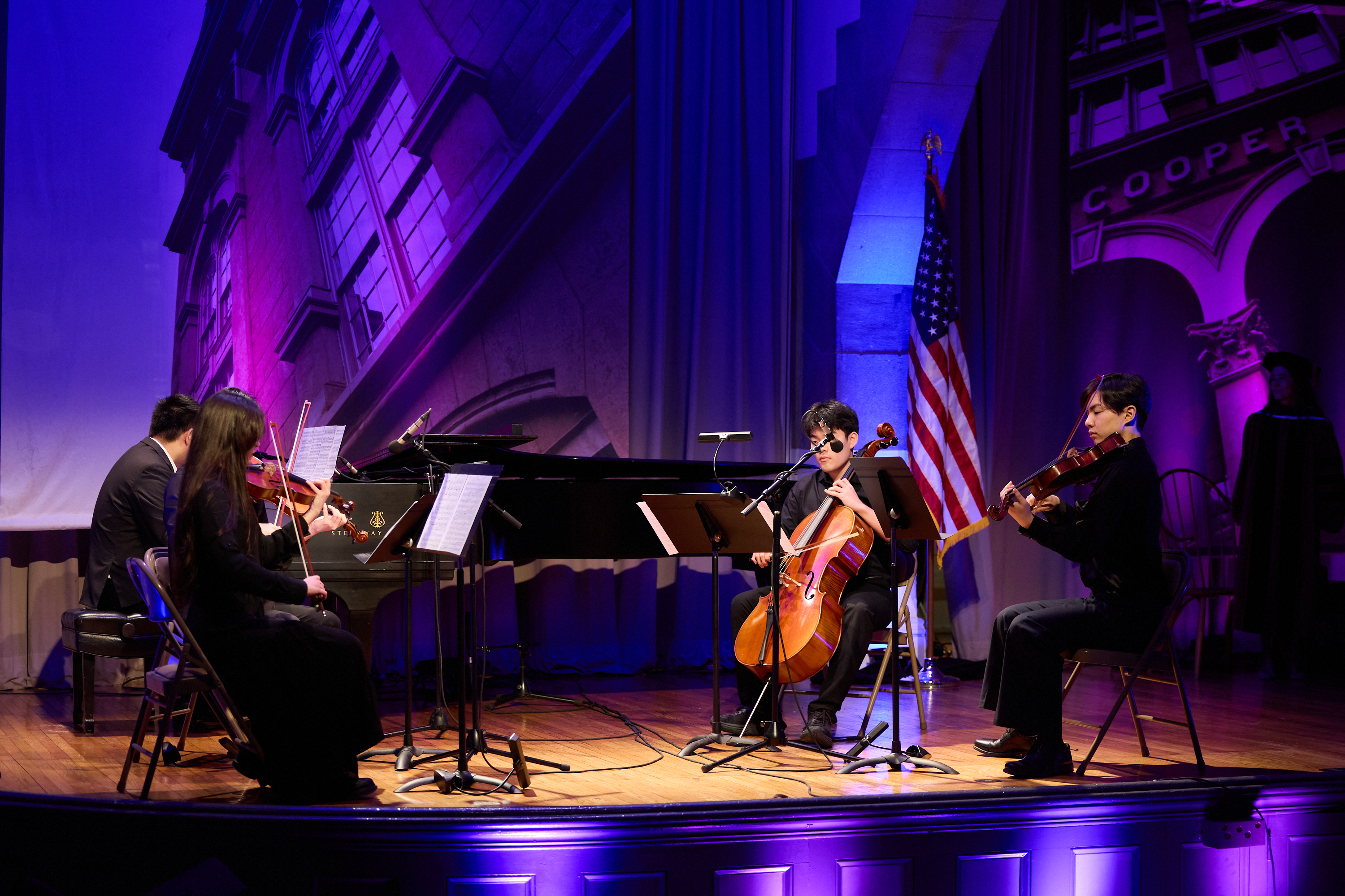 Poco a Poco performs (Rue Hu CE’29, violin; Nolan Jin AR’30, viola; Yuno Lee ChE’29, cello Miya Mese-Jones ME’28, violin; Benny Young CS’29, piano)