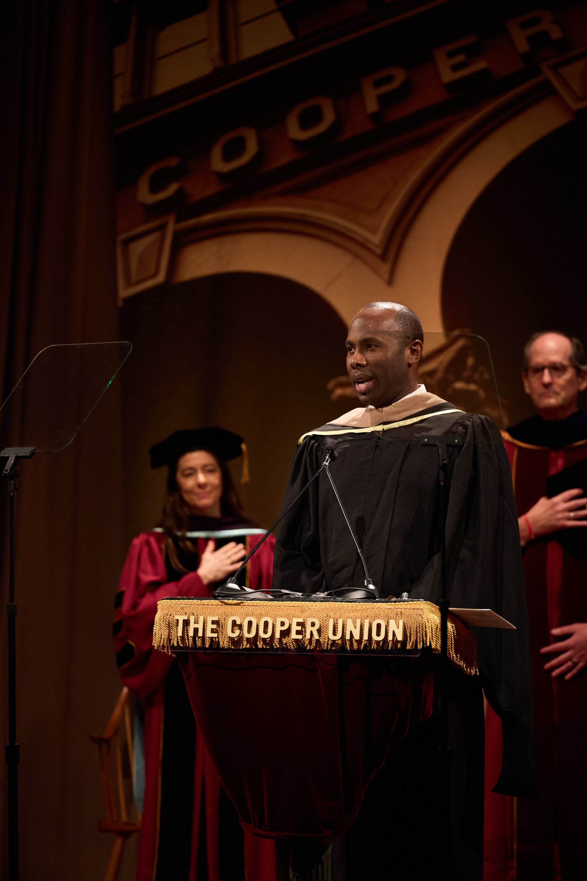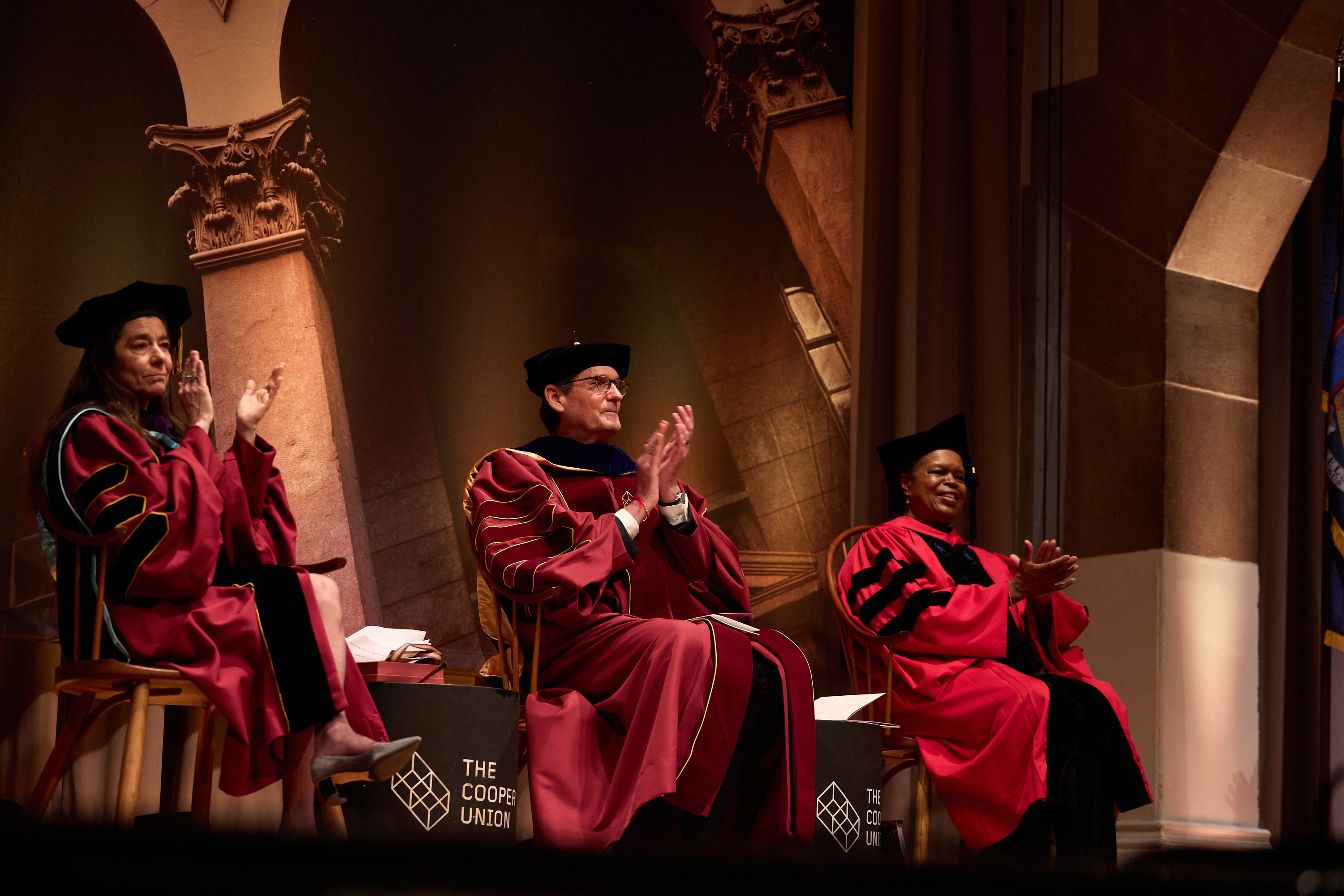 Steven W. McLaughlin was inaugurated as the 14th president of The Cooper Union on Friday, March 27, 2026 in the Great Hall. An array of notable guests was on hand, including Dr. Kaye Husbands Fealing, the assistant director of the Social, Behavioral and Economic Sciences Directorate at the National Science Foundation, who delivered the keynote address, and Ángel Cabrera, president of the Georgia Institute of Technology. The celebration included students, faculty, alumni, and local leaders, as well as guests from institutions across the country. These included incoming dean of The Irwin S. Chanin School of Architcture Michael Young, who led the processional, and student chamber ensemble Poco a Poco whose musical performance bookended the ceremony. School of Art junior Jane Forrest presented a poem she composed for the proceedings, and civil engineering seniors Sinclair Kennedy-Nolle and Isabella Ng CE’26 and third-year architecture student Zekaiya Whittington also offered remarks.
