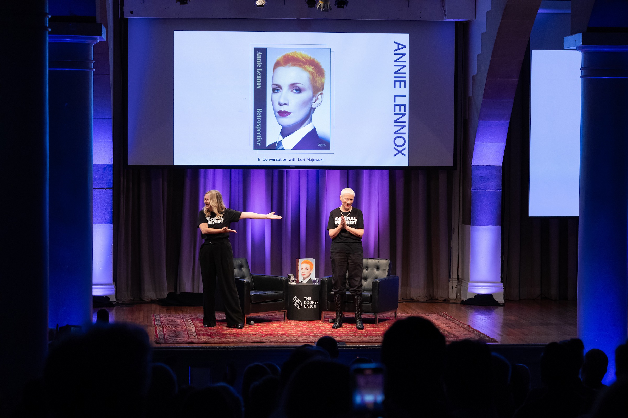 Music journalist and SiriusXM radio host Lori Majewski introduces Annie Lennox at the October 14, 2025 Gardiner Foundation Great Hall Forum event. Photo by Beowulf Sheehan