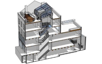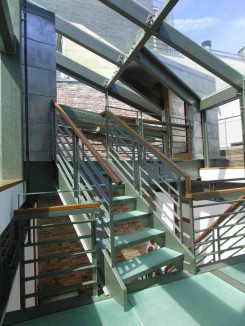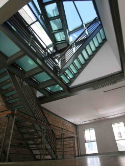 Originally built in 1830 as a Federal style residence, the structure had, by 1880, evolved into a mercantile loft building. In 2010 the building was converted into an urban villa with an attached apartment and two floors of workspace. The artist’s triplex loft is organized around an atrium that passes through the three floors of space, bringing daylight and visual connectivity to the interior reaches of the building. The atrium bridge, diagonally oriented across the vertical core space, connects the north and south terraces of the penthouse. The bridge derives its skewed geometry from a shift in the street grid that occurs at this location.