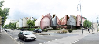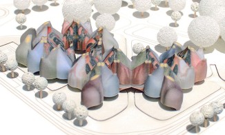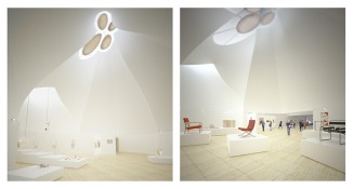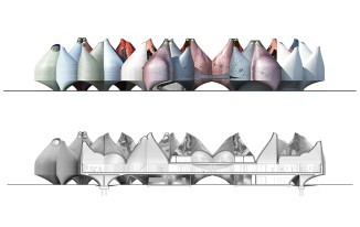 Our proposal for the Bauhaus Museum Dessau acknowledges these tensions through the design of a building as a collection of individual masses aggregated serially through a grid. We are calling these objects “vessels” as they allude to the crafted object of a vase or volumetric container. The vessels hover above the site on trunk-like legs, creating a light touch in the park and allowing passage underneath. The bellies of the vessels swell to touch each other creating an open continuous floor plan that connects the entire museum with a single floor. These combinations allow the building to fluctuate character between a huddle of singular objects, a sinuous coil of continuity, and a matrix of gridded repetition. Each attitude is at odds with the others, a productive tension resonating through the design.
