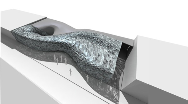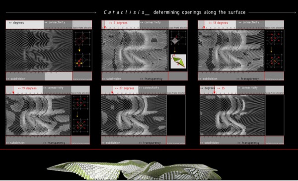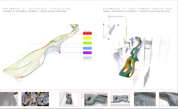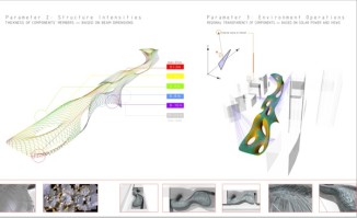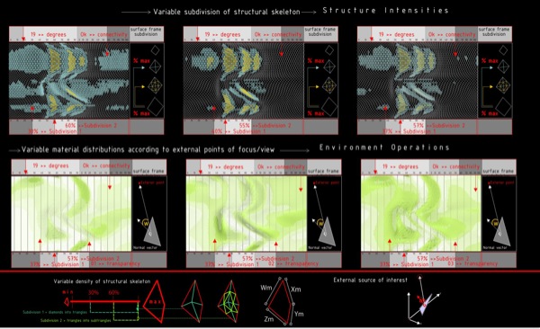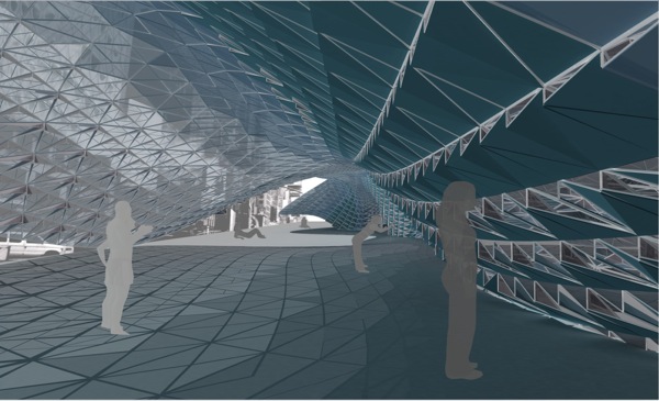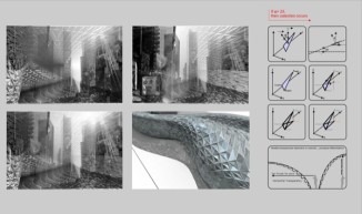 Crystal Shelter is an urban environment made out of various pieces of recycled glass, photovoltaic cells and electrochromic glass parts. The reused glass pieces are positioned on a new armature among solar-powered cells and electrically charged electrochromic materials according to the specific formal and material properties – transparency and reflection – of each piece. The new composite enclosure becomes a mosaic that negotiates the relationship between exterior and interior space in the city. The transparency of the exterior envelope topically changes according to the input of solar energy and the location of the user. The recycled glass pieces, the photovoltaic cells – which convert solar power to electrical current – and the electrochromic materials – which change from clear to translucent according electrical charge – synthesize a thick composite exterior envelope which locally changes thus revealing to the user different fragmented views of urban space. Crystal Shelter necessitates an enhanced degree of tactile and optical engagement from the user, who is urged to discover new ways of spatial occupation and senses of viewing through multiple mosaic layers of glass. The variable, non-homogenous material allocation in the envelope emerges from precise rules and constraints that relate to a number of parameters including solar power input, possibilities for programmatic occupation, structure and vision.