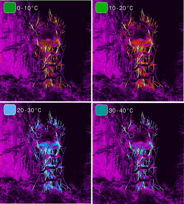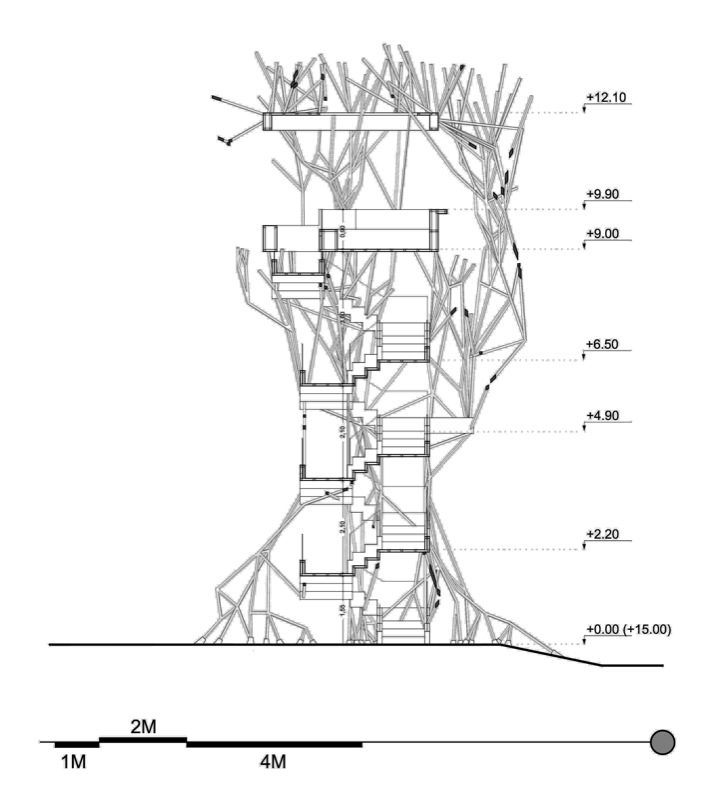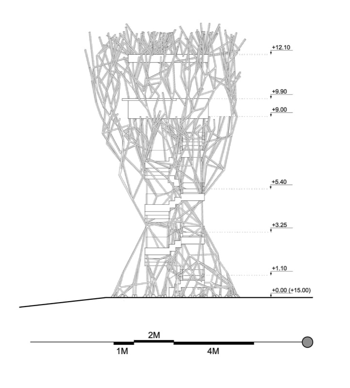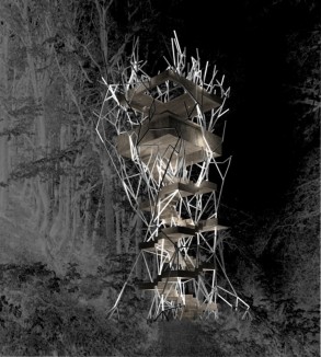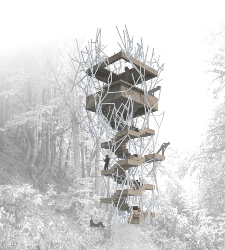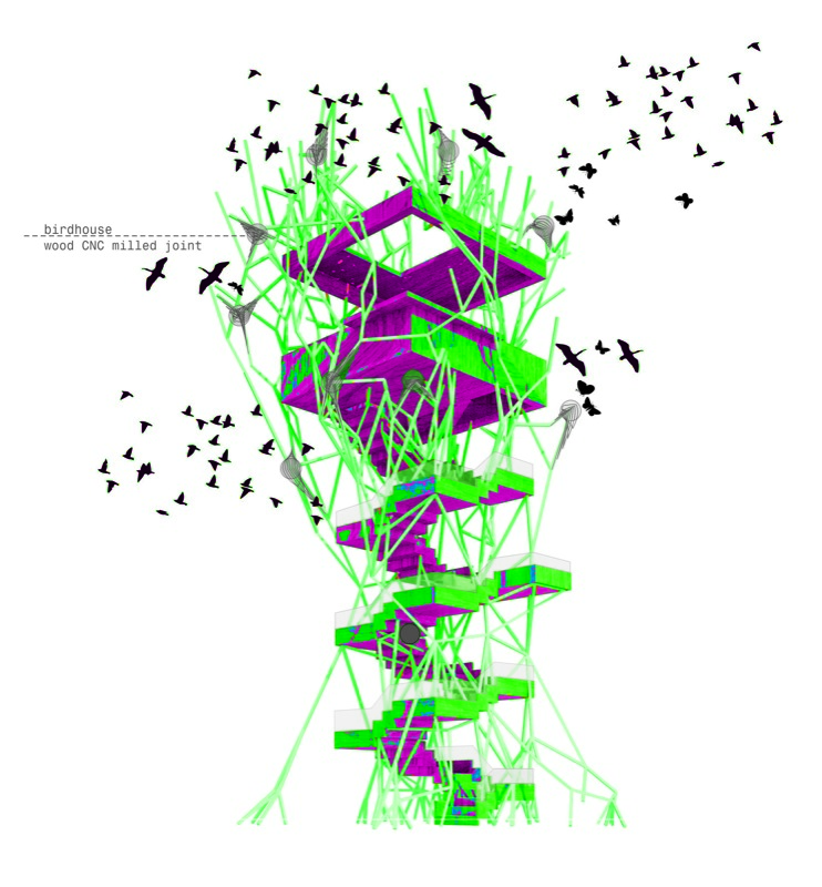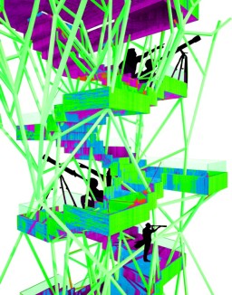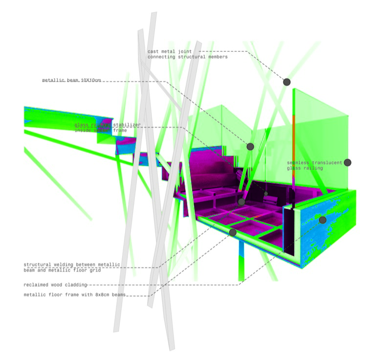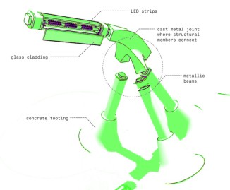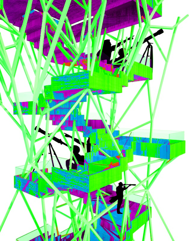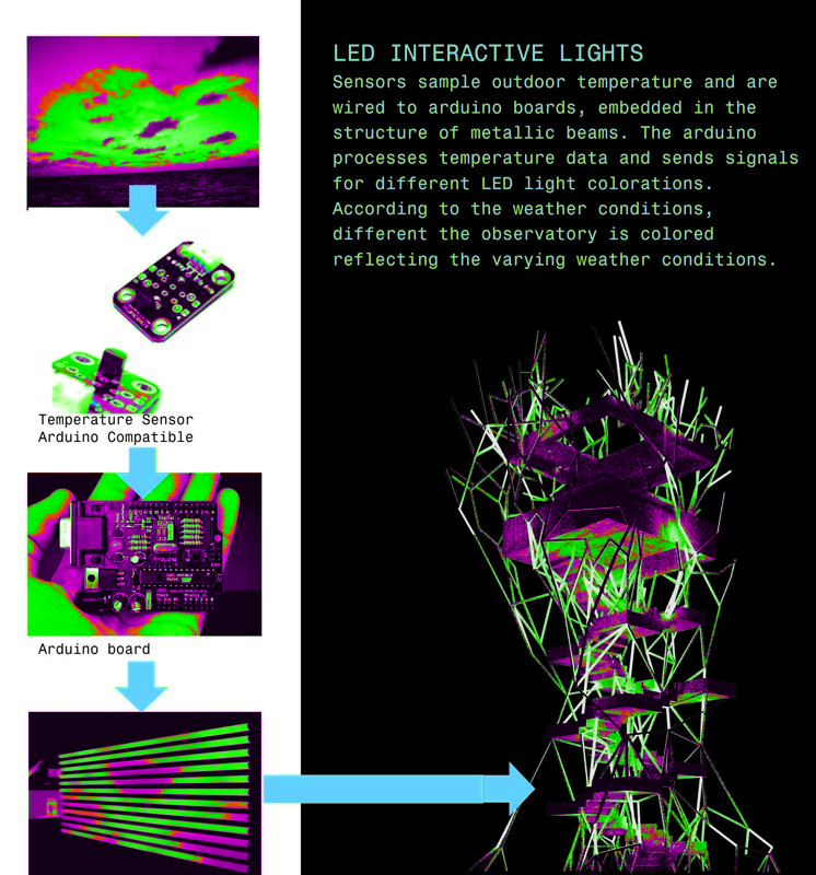Daphne is an elevated public room extracted from Renzo Piano’s masterplan grid for Faliron Bay in Athens, Greece. The observatory is an environmental intervention along the spine of an artificial tree; branches illuminate the park with different light colors based on temperature thresholds. The project is currently under construction.