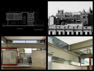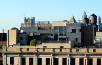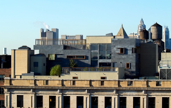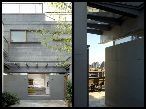 This multi-level PH designed for living and working sits atop a 12-story turn of the century building in lower Manhattan. Conceived both architecturally and programmatically as 3 distinct elements, (floating horizontal mass = master bedroom apartment; vertical mass = children’s duplex; and lower north section = office and library) were separated and connected by contiguous common areas. The voids between these volumetric figures are the open spaces that tie the architectural assembly together. These spaces unite to form a continuous zone of interior and exterior circulation spaces, comprised of a garden court, a vertically oriented atrium containing the main stair, and the open area of the main space below the suspended east volume. The central atrium is defined by curtain wall and skylight assemblies and has a suspended glass floor mezzanine. A decommissioned (and monumental) masonry chimney is incorporated into the glass curtain wall on the south side of the atrium opposite the stair. The project won the prestigious Chicago Athenaum Prize for American Architecture in 2005 as well as AIA design awards.