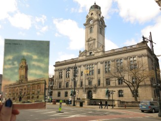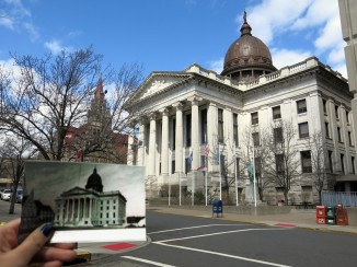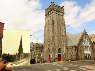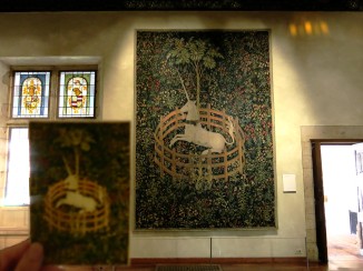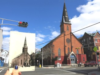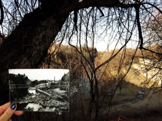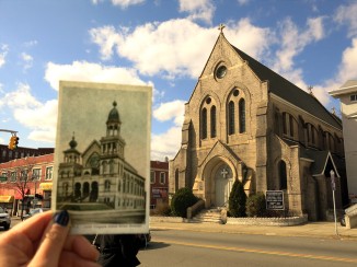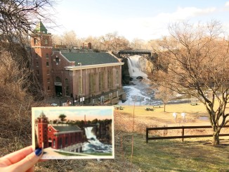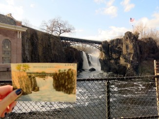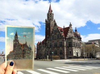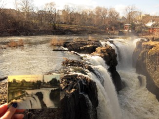 Drawing from Williams’ allusion to The Unicorn Tapestries, I appropriated the image of “The Unicorn in Captivity” and used this as a key to recontextualize my reading of Paterson. After identifying particular vertical towers within the city that were emblematic of its former glory, I likened them to the stakes of the fence that encloses the unicorn. The Great Falls, whose stature had been exceeded by its surrounding cityscape, became the symbolic unicorn. On my fifth and final trip to Paterson, I embarked on a pilgrimage that I had devised for the city. Positioning myself in front of each architectural monument, I held a historic image in my hand, layering it with the present in the background. This photo series would become representative of my role as both interceptor and mediator of the city.