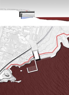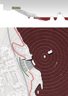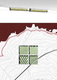 Rather than proposing a master plan that covers the area of the entire site, the project identifies several nucleuses of future developments. Each individual program has a distinct relationship with the seashore and the limestone rock. They all react to the topographical conditions of the site, which are transformed into architectures that offer amusement, repose, education, and all kinds of experiences related to the the city of Archimedes, and the Homeric times: a bath, a music stage, an orchard, a refuge, an observatory, etc. The individual sites are connected by paths that follow ancient and modern and by imaginary traces: The railway track, the footprint of the Dionysian wall, and the mythical seashore.