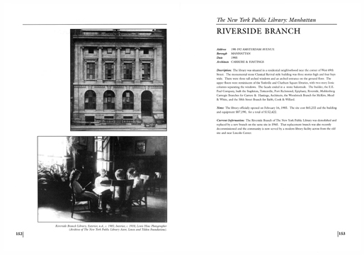 Fifty-four of these libraries are still used today, comprising over a quarter of the New York Public Library system. This publication is a historical, cultural and architectural overview of the New York City Carnegie Libraries, with photographic documentation of the extant libraries and extensive bibliographic information on Carnegie libraries.