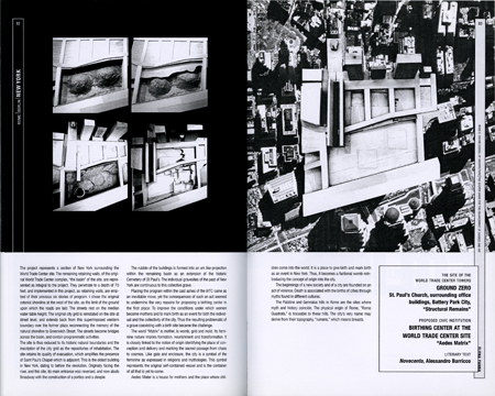 All the participants in this class witnessed the 9/11 event with their own eyes. Whether seen from the roof of the Cooper Union building or within the streets of New York, each student and faculty member proceeded to address the civic space of architecture at the scale of the city, past, present, and future, for one semester. Although there is only one project specifically proposed for the Ground Zero site, the subject as a whole can be seen as an address to the question. This study as conducted in the aftermath of this monumental urban event is motivated toward the creation of intimate civic space with inventive contemporary program. As the city is now open for redefinition, the project can be considered to address the future conscience necessary to solve the problems posed. The institutions proposed integrate an understanding of the relation between form, site, and program within a literary vision of the possibility of the city.