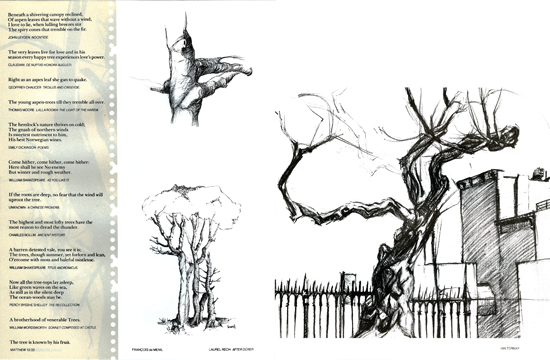 Trees celebrate life and death. Their branches flare upward in the sky attempting to offer perches to the angels and trees root down into the earth encompassing the remains of the long dead. Man cuts trees to produce his own casket. The sap of some trees gives forth a sweetness to the lips. To draw them is to taste them.